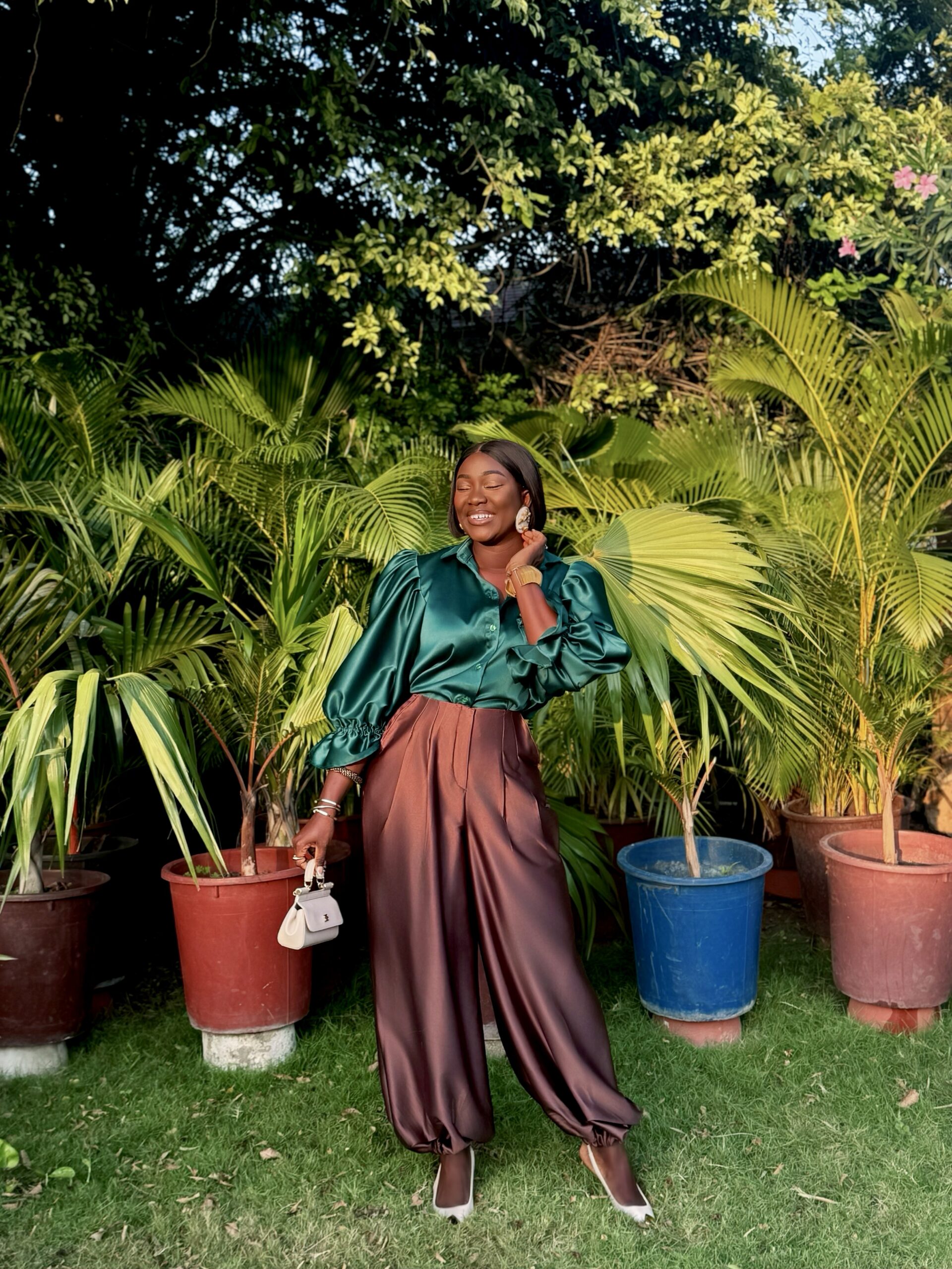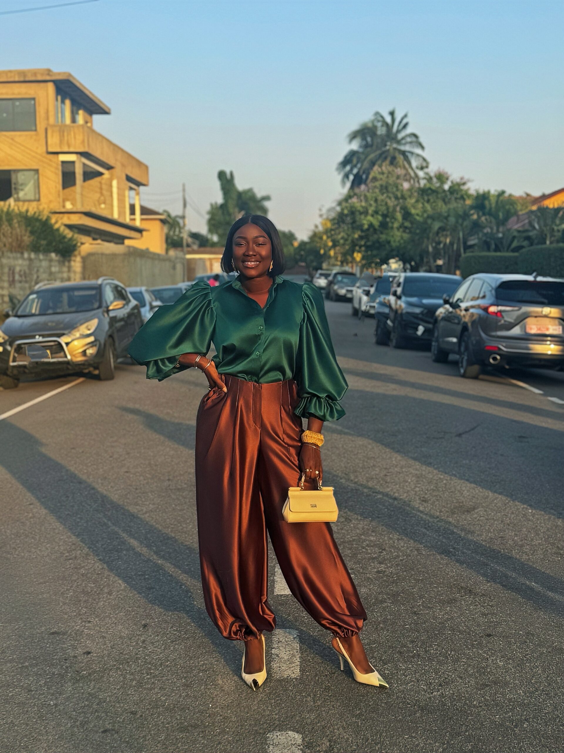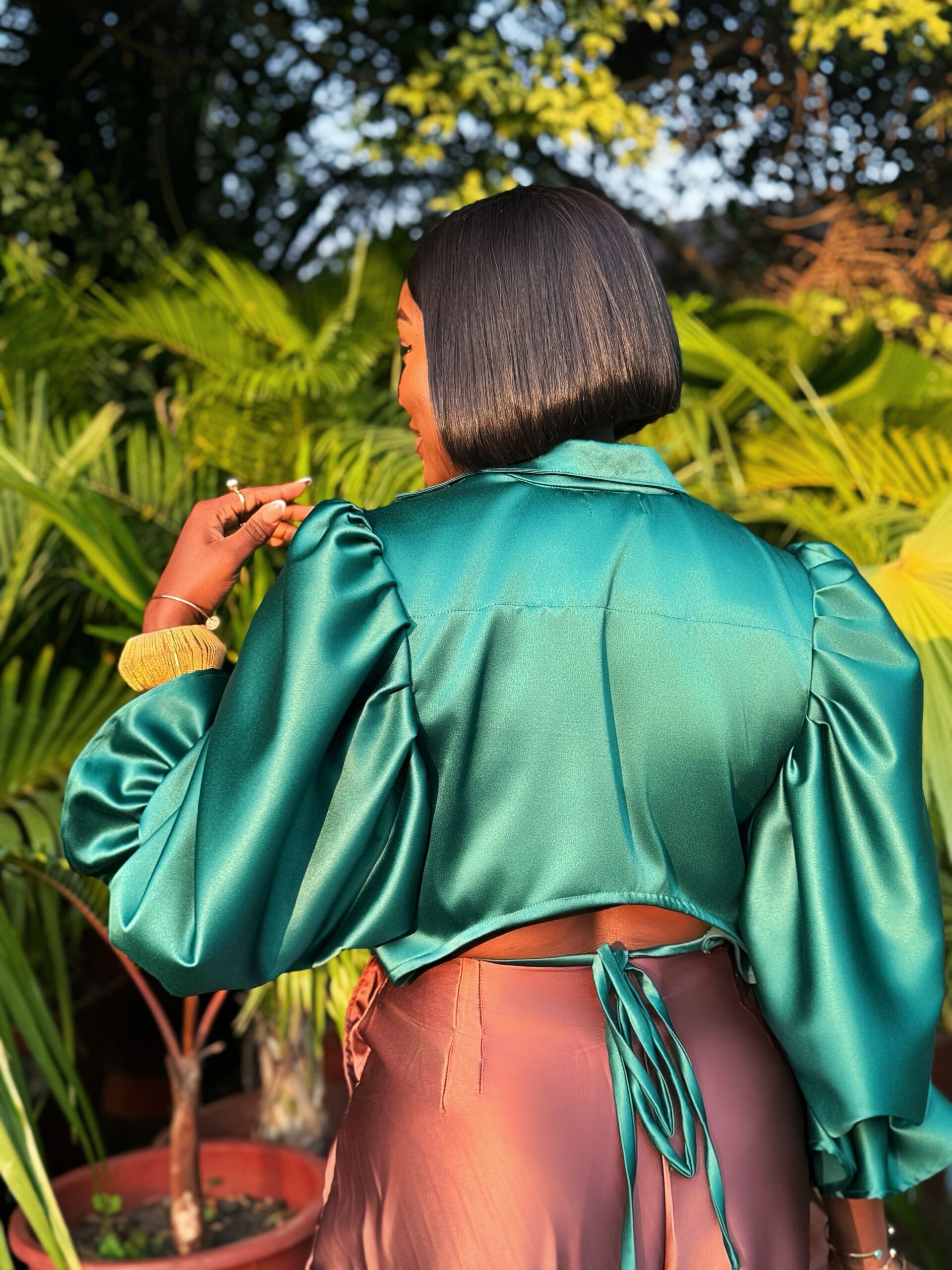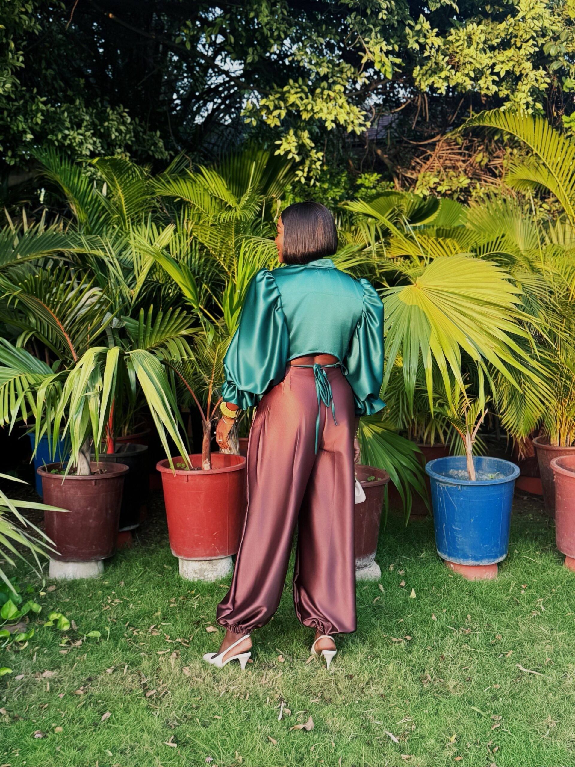 Experience ultimate elegance with our Ako Set, a masterclass in sophisticated color-blocking. The set features a breathtaking, jewel-toned emerald green blouse crafted from luminous satin. It boasts a classic button-down front, sharp collar, and statement-making puff sleeves that gather gracefully at the wrist.