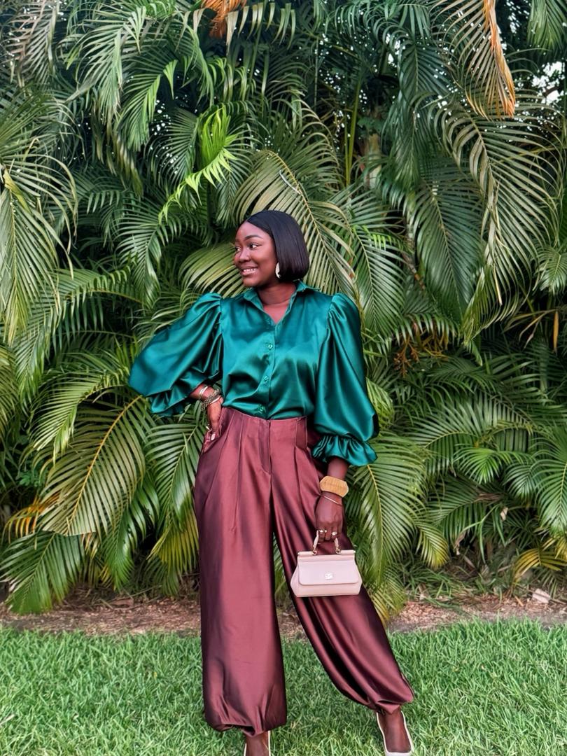 Paired perfectly with the top are high-waisted, wide-leg trousers in a deep, complementary chocolate-brown satin. These pants are designed to flow with every step, creating a stunning and elongated silhouette. This versatile set can be worn together for a high-impact look or styled separately for endless wardrobe possibilities.