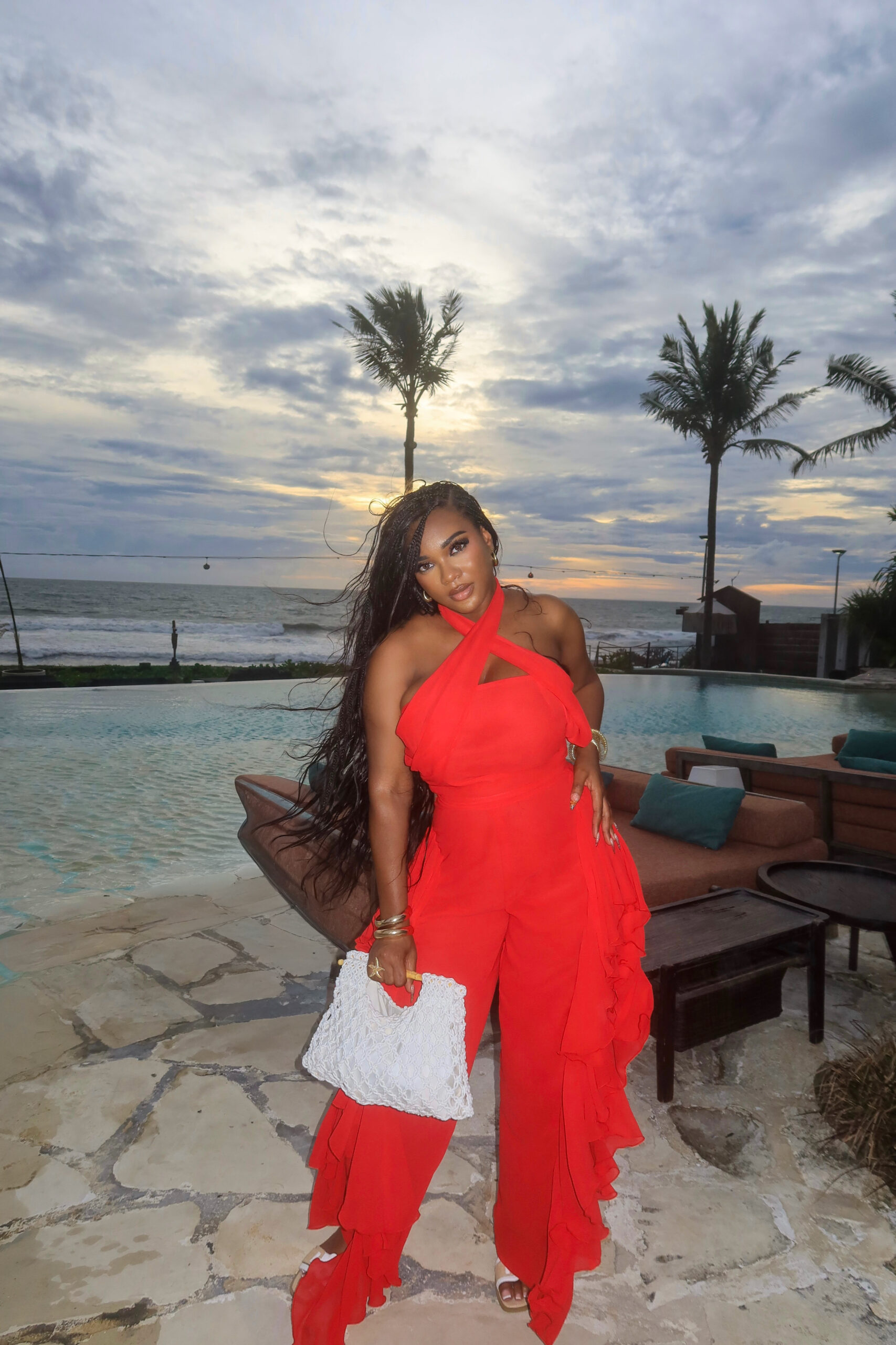 Step into the spotlight with our Cairo Set, a high-impact ensemble designed for the ultimate getaway. The top features a chic, form-fitting halter neck with a daring criss-cross front that elegantly highlights the shoulders. It is paired with statement-making wide-leg trousers that boast dramatic, fluid ruffles cascading down the side seams for incredible movement with every step. Crafted in a radiant red hue, this set is perfect for beachside galas, sunset dinners, or any premium occasion that calls for effortless luxury.