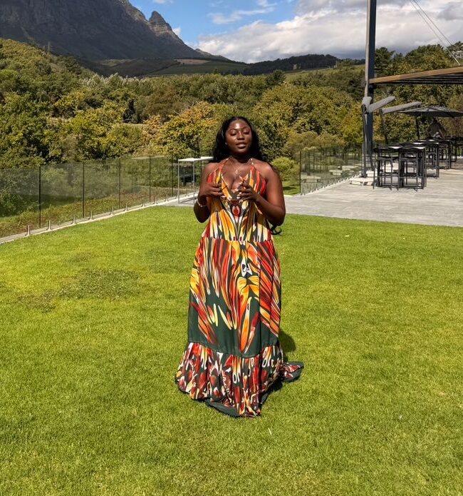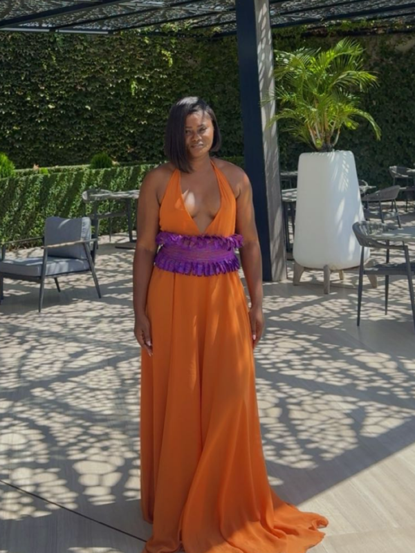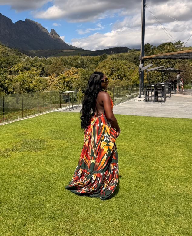 The skirt cascades beautifully into a voluminous, floor-length hem with a subtle tiered detail, creating mesmerizing movement with every step. Whether you’re attending a destination wedding, sipping cocktails at a vineyard, or strolling through a high-end resort, this vibrant, head-turning dress guarantees a picture-perfect look.