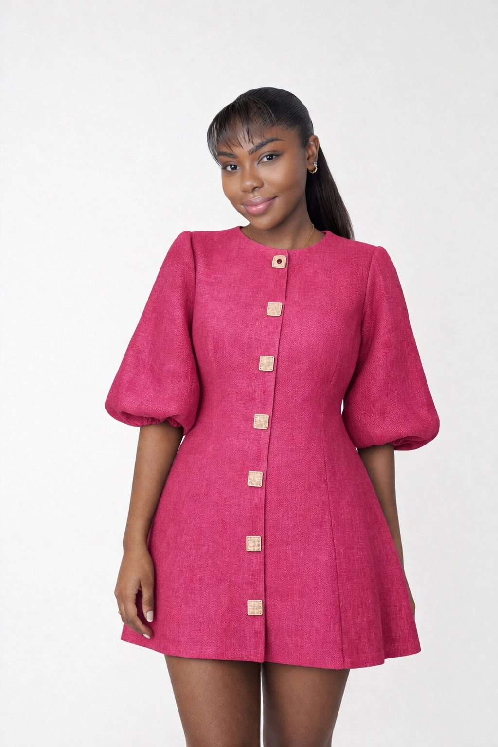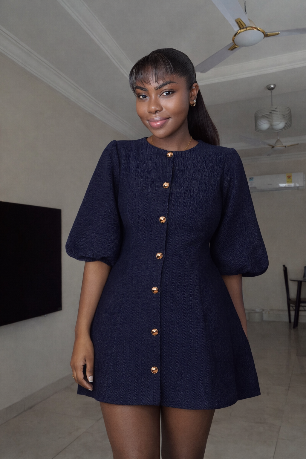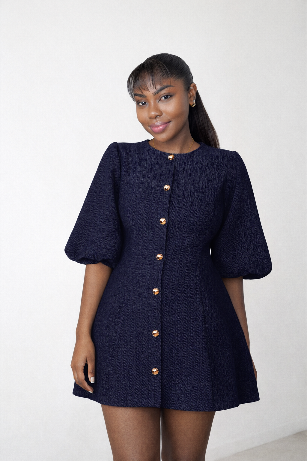 The Zina Dress is the perfect blend of playful charm and high-fashion structure. Available in both structured denim and breathable linen finishes, this mini dress features a modest high neckline and signature elbow-length puff sleeves that create a bold silhouette. The front of the navy denim version is elevated with polished gold buttons for a refined touch.