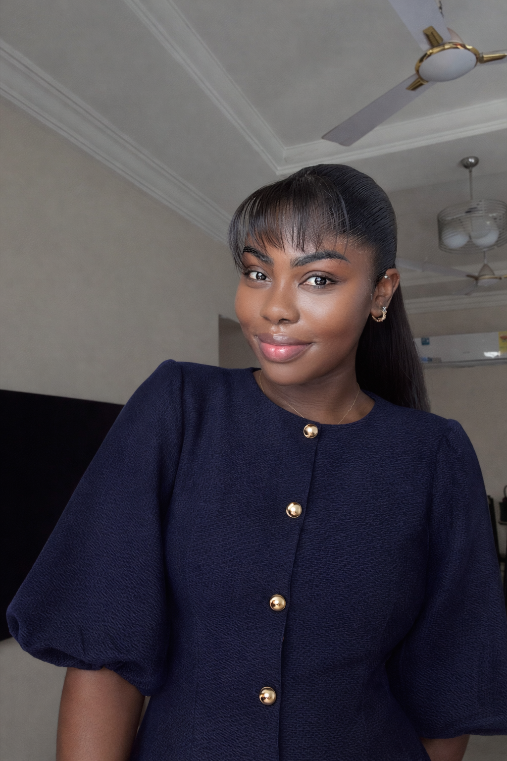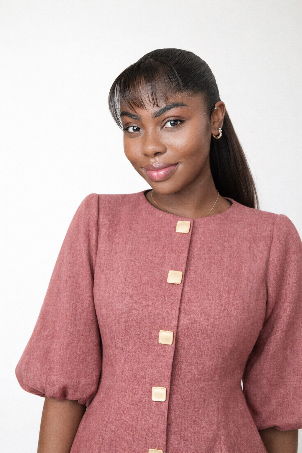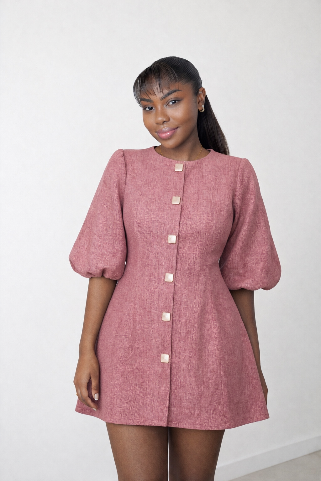 The Zina Dress is the perfect blend of playful charm and high-fashion structure. Available in both structured denim and breathable linen finishes, this mini dress features a modest high neckline and signature elbow-length puff sleeves that create a bold silhouette. The front of the navy denim version is elevated with polished gold buttons for a refined touch.