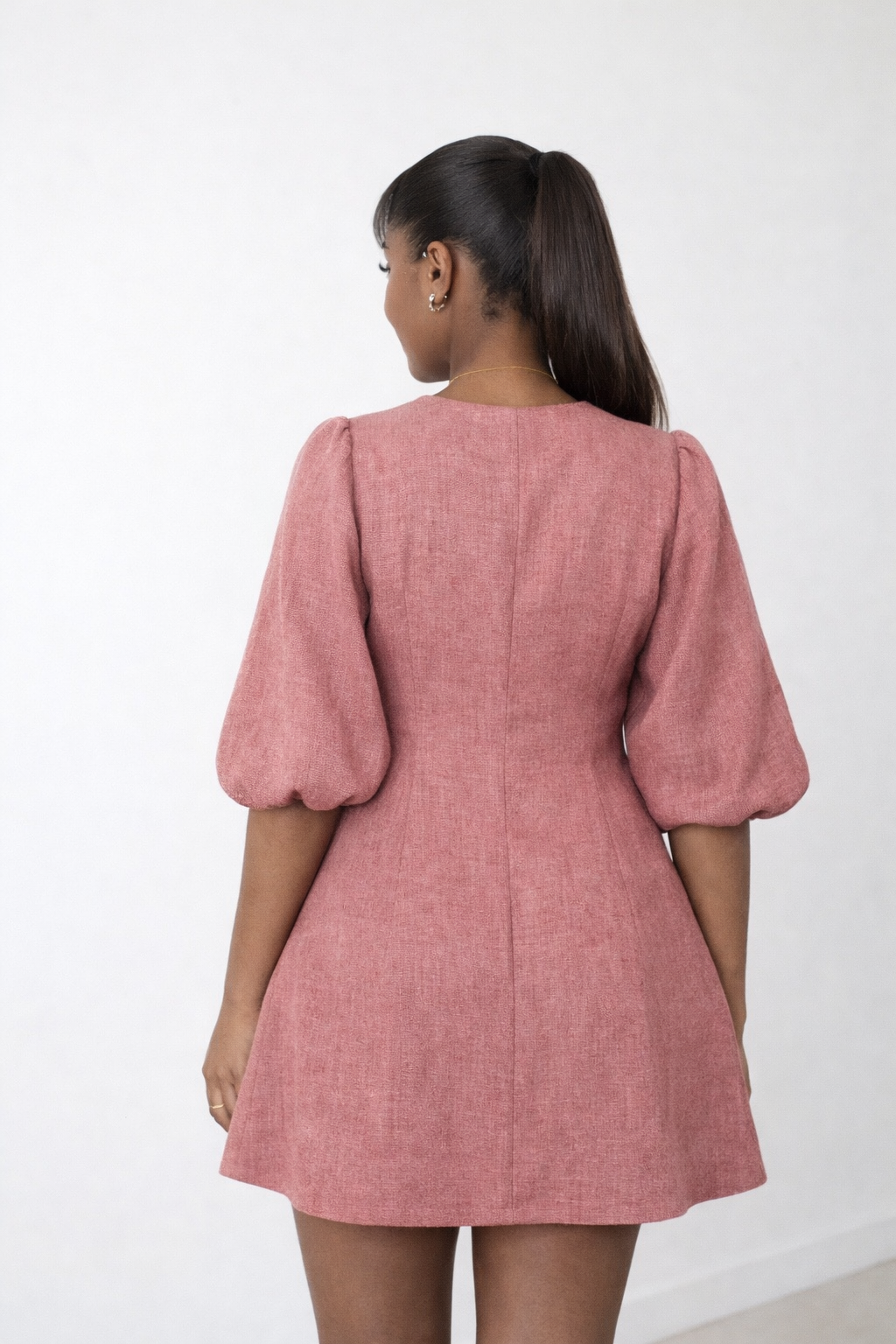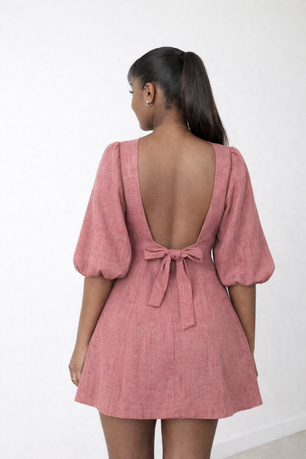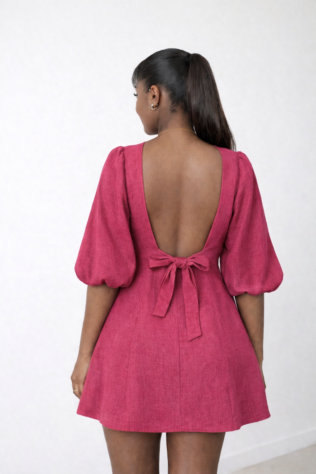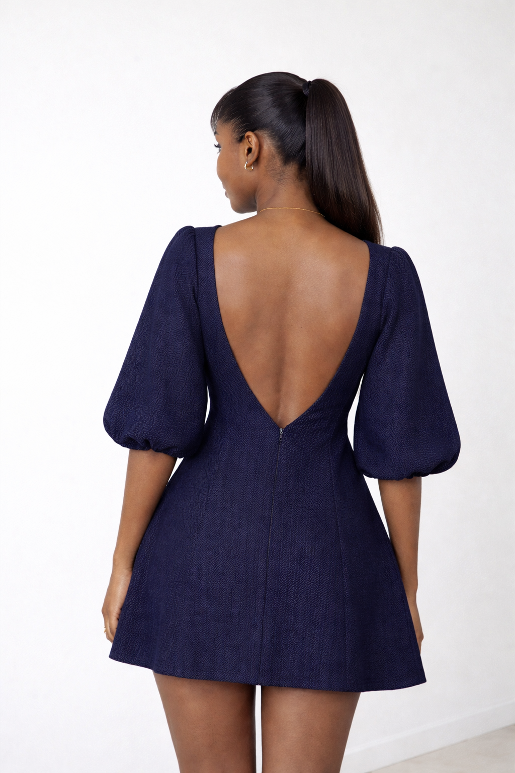 Make a sophisticated statement in the Zina Dress, a tailored mini featuring voluminous puff sleeves and a daring open-back design.
